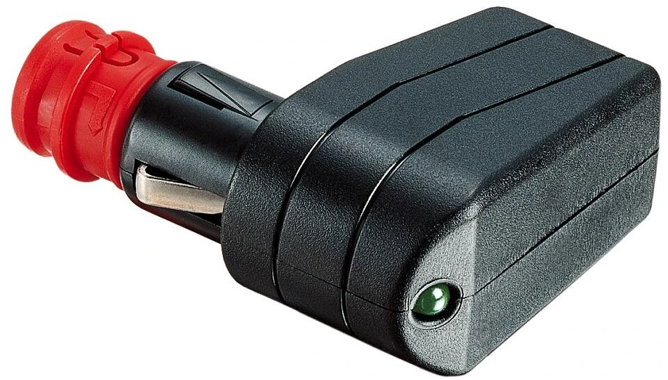 Mit Funktionskontrolle mittels Leuchtdiode. Integrierte Reitersicherung, festarretierbare Ausgleichshülse durch Bajonettverrastung und Schraub-Zugentlastung, bis max. 1,5 mm passend für Zigarettenanzünder- und Normsteckdosen nach DIN ISO 4165.