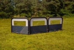 Der Wind- und Sichtschutz mit transparenten Fenstern besteht aus 2 Segmenten á 200 cm. Der Windschutz kommt ohne Gestänge aus und stellt sich durch einfaches Aufpumpen der Luftschläuche fast von selbst auf. Alle Segmente können beliebig mit Reißverschluss verbunden werden.