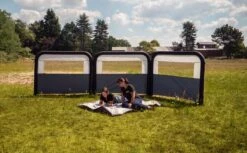 Der Wind- und Sichtschutz mit transparenten Fenstern besteht aus 2 Segmenten á 200 cm. Der Windschutz kommt ohne Gestänge aus und stellt sich durch einfaches Aufpumpen der Luftschläuche fast von selbst auf. Alle Segmente können beliebig mit Reißverschluss verbunden werden.