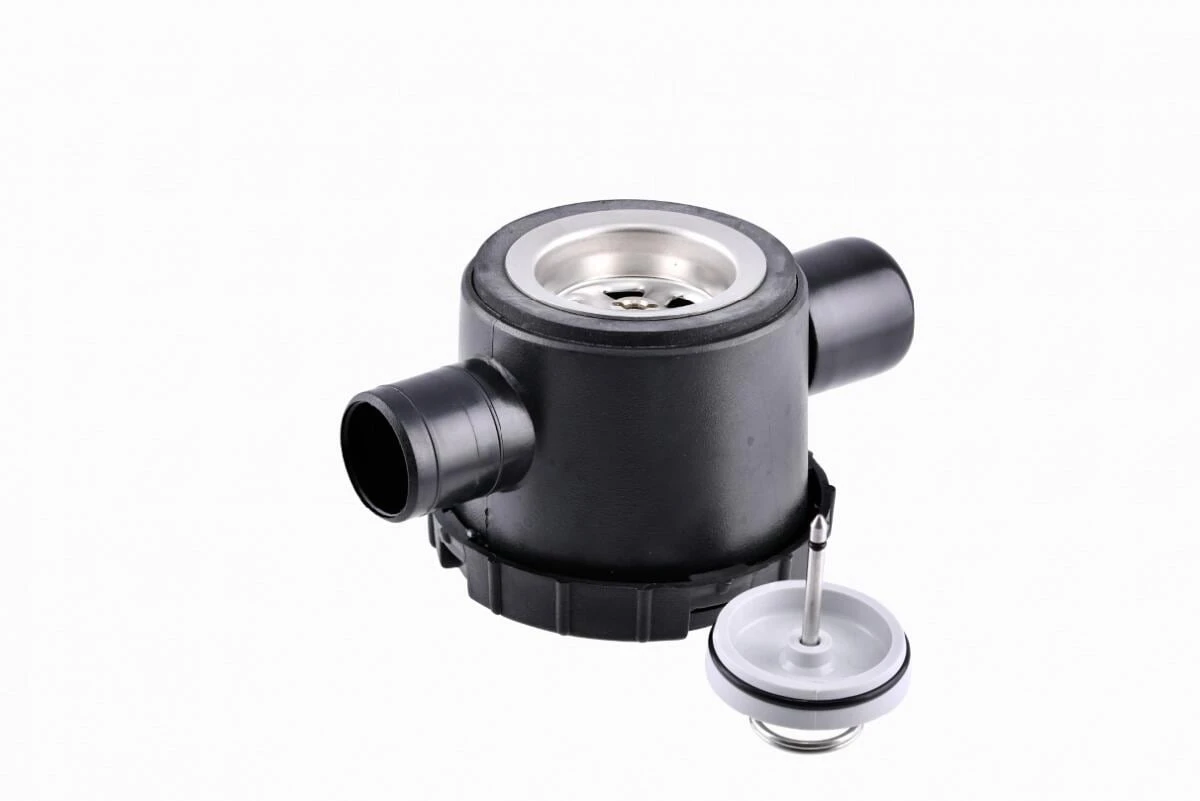 Siphon mit 2 Zugängen, 33 mm mit Edelstahlsieb und Standardstopfen.
