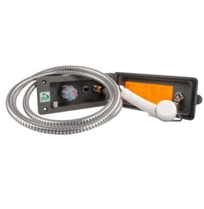 Wassersteckdose inklusive Außendusche und Vormischer für Kalt- und Warmwasser. Mit Brausearmatur Charisma und Carletta-Schlauch. Mit Microschalter zum Einschalten der Tauchpumpe. Auch für Druckpumpen bis 3 bar.