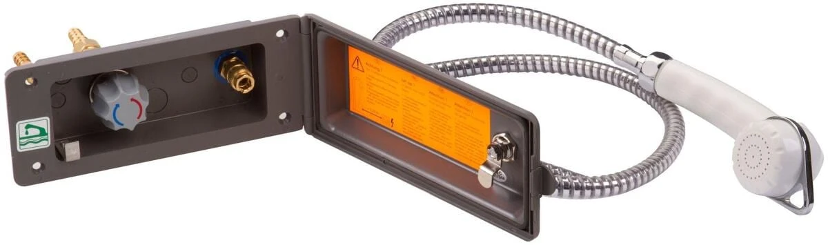 Zur Kalt- und Warmwasser Entnahme. Mit Vormischer, Brause-Armatur und Schalter zum Betätigen der Pumpe.