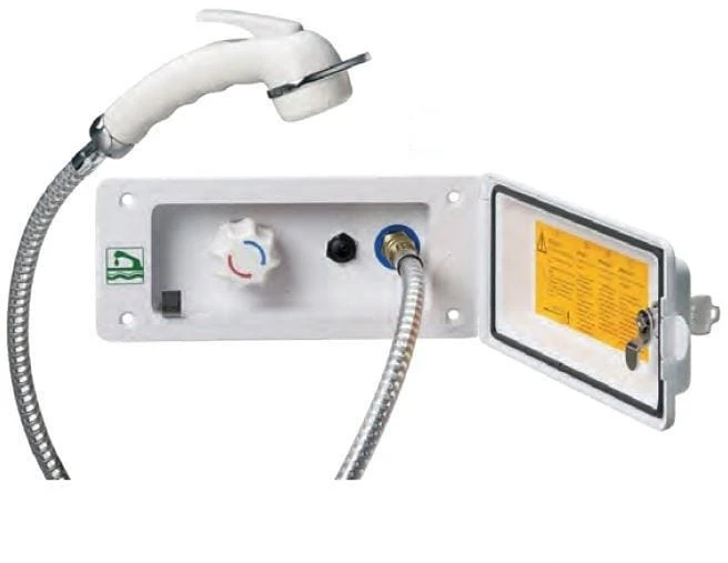 Zur Kalt- und Warmwasser Entnahme. Mit Vormischer und Brause-Armatur zum Betätigen der Pumpe.