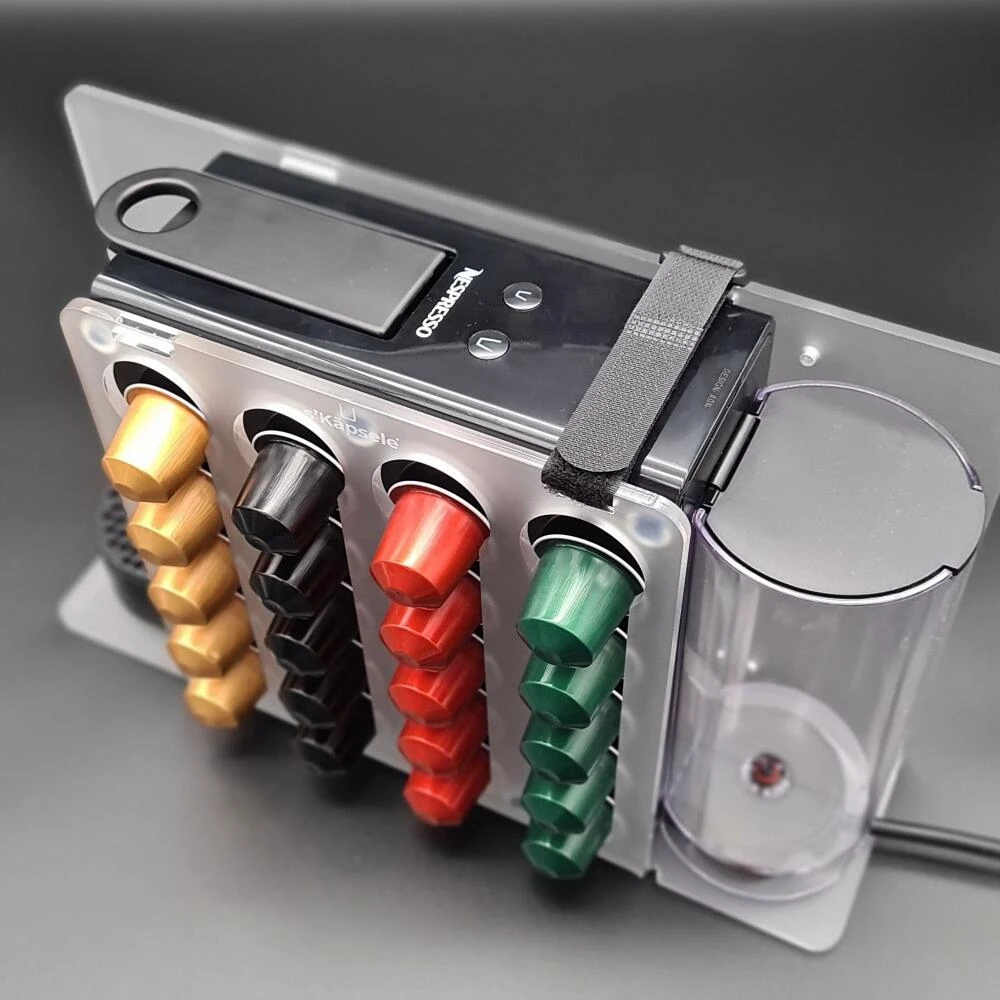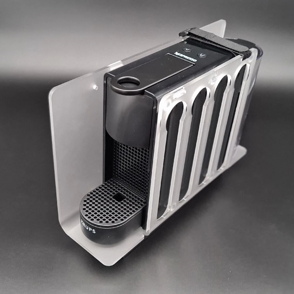 Bei unserem s’Käpsele handelt es sich um eine stabile Halterung welche aus einem Stück Plexiglas gefertigt ist. Es ist lasergeschnitten und wird thermoplastisch in Form gebracht. Das s’Käpsele kann durch die variable Befestigung in unterschiedlichsten Fahrzeug- und Aufbautypen angebracht werden. Es kann an einer senkrechten Wand, einem Möbelkorpus oder einem anderen stabilen und tragfähigen Untergrund angeschraubt werden. Auch ist die Montage auf einem Podest, einer Ablage oder sonstigem Möbel freistehend möglich. Durch das symmetrisches Design des s’Käpsele ist ein links- als auch rechtsseitige Wandmontage möglich. Die Kaffeemaschinen kann von beiden Richtungen/Seiten eingeschoben werden. Die Halterung verfügt über antirutsch Elastikpuffer welche in Kombination mit dem mitgelieferten Befestigungsband für einen sicheren und stabilen Halt der Kaffeemaschinen innerhalb der U-förmigen Halterung sorgen.