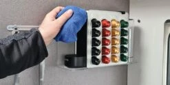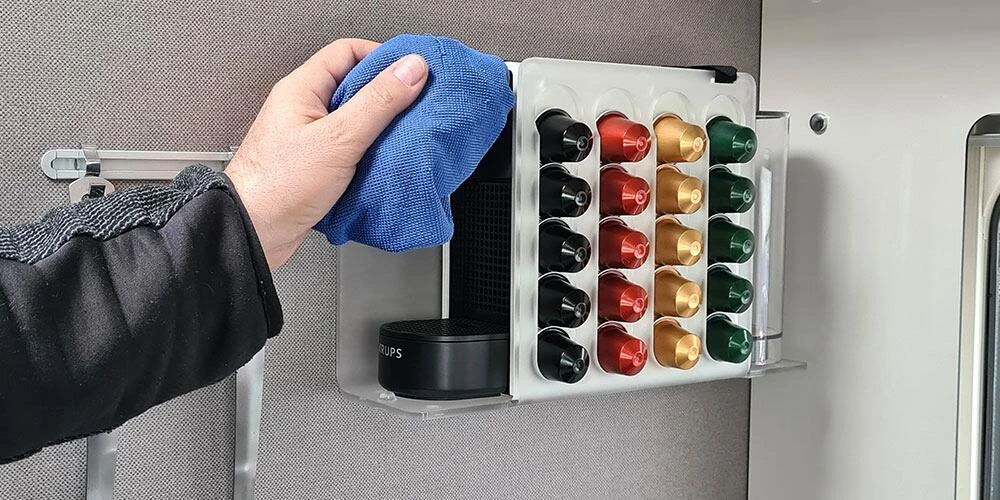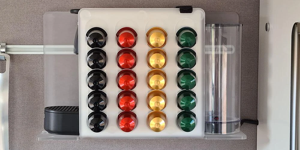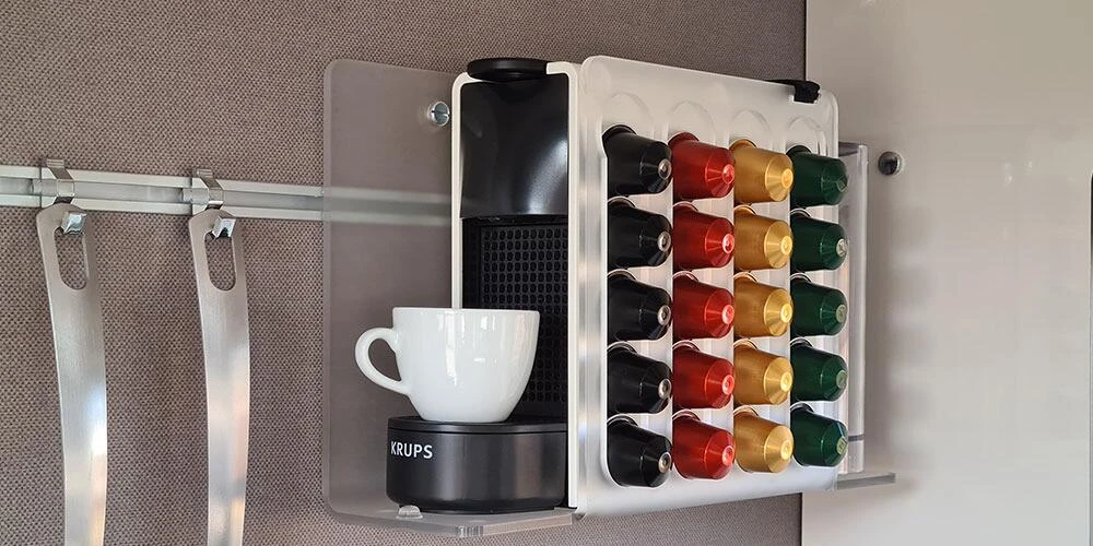 Das s’Käpsele® bietet als zusätzliches Highlight genügend platz für eine Vielzahl von Kaffeekapseln. So benötigen diese keinen weiteren Stauraum und sind jederzeit für Ihren Kaffeegenuss Griffbereit. Die Kaffeekapseln können auch problemlos während der Fahrt im s’Käpsele® verbleiben. Die bunten und farbenfrohen Kaffeekapseln geben der Gesamtkonstruktion unseres s’Käpsele ein tollen und ansprechenden Gesamteindruck, fast so wie ein kleins Kunstwerk. Das lästige Auf- und Abbauen Ihrer Kaffeemaschine gehört endlich der Vergangenheit an. Das betriebsfertige s’Käpsele ® fügt sich harmonisch in die Küchenlanschaft Ihres Wohnwagens, Reisemobil, Camper oder auch Boot ein. Durch die satinierte Optik scheint die Kaffeemaschine und die Kaffeekapseln förmlich zu schweben. Des weiteren bleibt das s’Käpsele durch diese Oberflächenstruktur lange hübsch und ist gegenüber Kratzern recht unempfindlich. Das s’Käpsele ® setzt optisch als auch funktionell neue Maßstäbe und hebt sich so von anderen Küchenhelfern ab. Keine Angst.