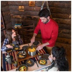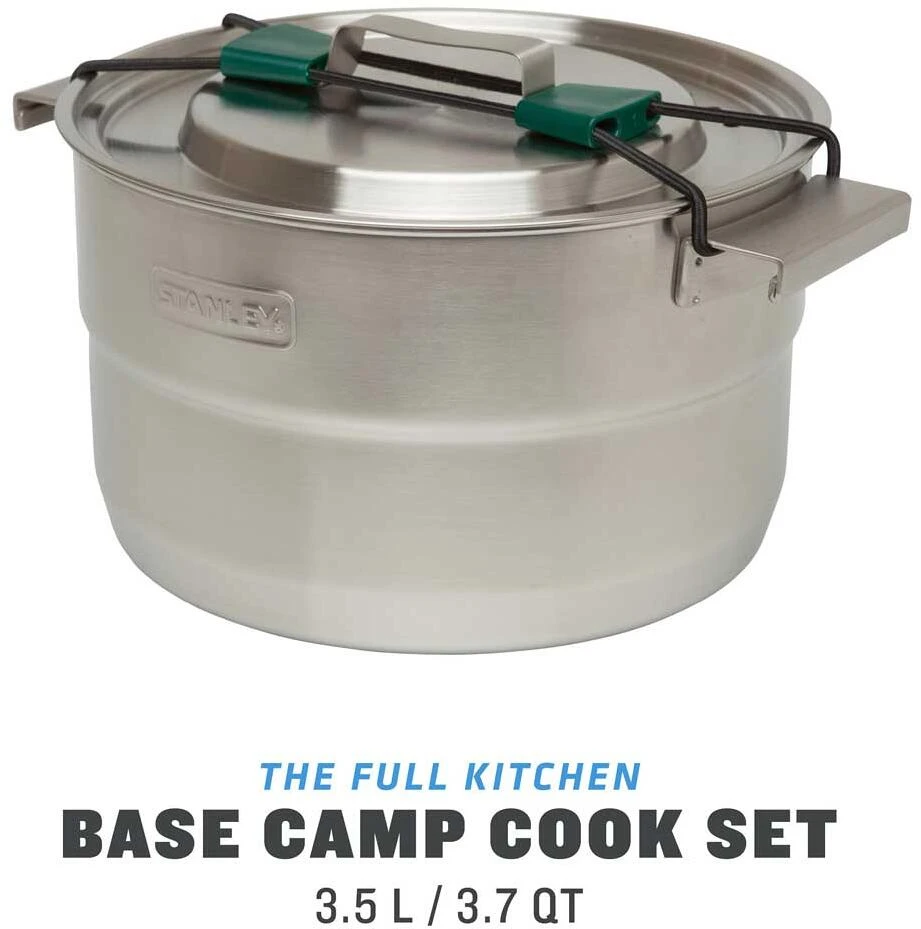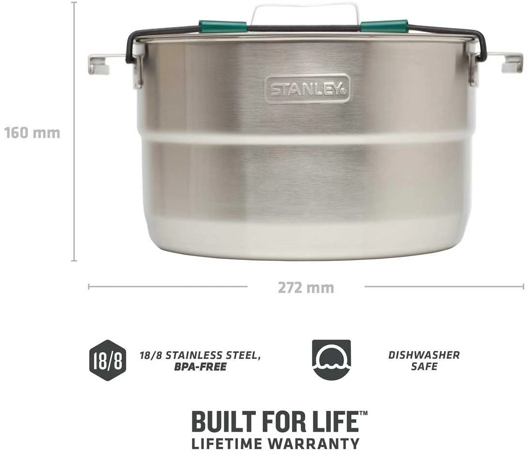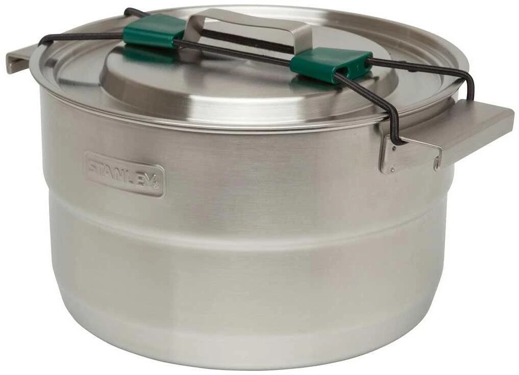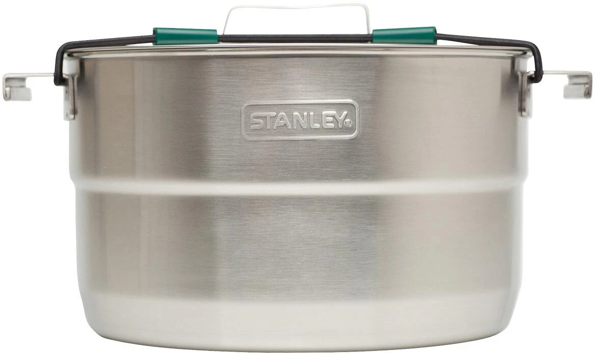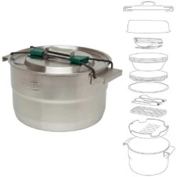 Einer für alles: Das Multitalent Stanley ADVENTURE BASE CAMP COOK SET ist ein Komplettset für die gehobene Camping-Küche. Der große Topf und die mit einem Sandwichboden ausgestattete Pfanne sind aus rostfreiem 18/8- Edelstahl. Zum perfekten Kochen und Genießen gehören außerdem: Ein Schneidbrett, ein Spatel, ein Servierlöffel, ein Topfuntersetzer zum Vorbereiten und Servieren sowie 4 flache Teller, 4 tiefe Teller und 4 Sporks zum Genießen der Outdoor-Mahlzeit. Schließlich komplettieren ein Abtropfbrett und ein Transport-Verschlussriemen das ADVENTURE BASE CAMP COOK SET als Deluxe-Camping-Kochset!