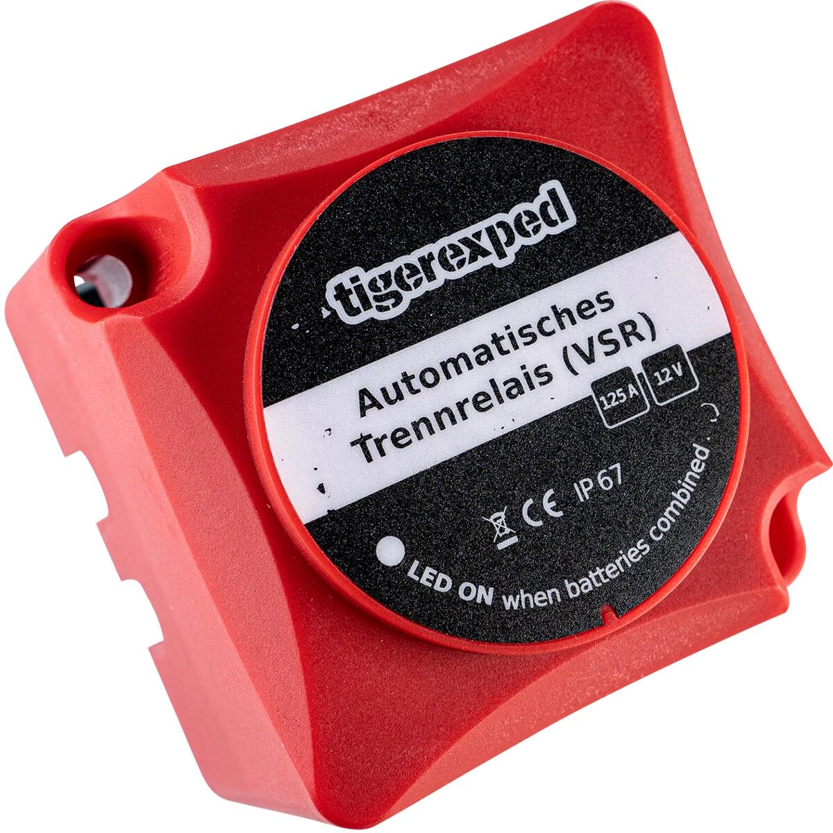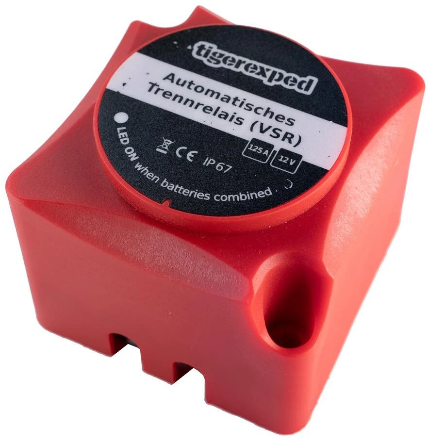 Das original tigerexped 12V Trennrelais zum Laden der Bordbatterie während der Fahrt. Sorgt für ein stets zuverlässiges Anspringen des Fahrzeuges indem es erst zur Zweitbatterie durchschaltet, wenn die Starterbatterie geladen ist. Beim Absinken der Spannung / Abstellen des Motors, wird der Stromkreis automatisch wieder getrennt (VSR = voltage sensitive relay). Das robuste Gehäuse verfügt über eine LED die anzeigt, ob das Trennrelais durchgeschaltet ist.