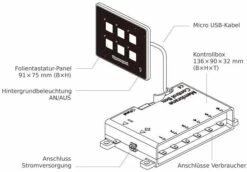 Die original tigerexped Schalttafel mit frei belegbaren Buttons, die individuell als Schalter oder Taster programmiert werden können, holt die Bedienung all deiner Geräte an einen zentralen Platz – und zwar höchst flexibel und optisch ansprechend. Während die Kontrollbox mit allen Anschlüssen der Verbraucher im Elektrofach / Schrank verbaut werden kann, wird das Panel bequem mit nur einem einzigen Micro USB-Kabel bis zu 5 m Länge an jeden beliebigen Platz geführt. Dort benötigt es statt Einbautiefe durch die Anschlüsse lediglich eine Bohrung zur Durchführung des USB-Kabels. Hinweis zum Mikro USB-Kabel: Das Kabel ist nicht im Lieferumfang enthalten und kann je nach gewünschter Länge als Standardprodukt gekauft werden. Bitte achte darauf, dass es eine ordentliche Abschirmung aufweist, also kein Billigprodukt kaufen!