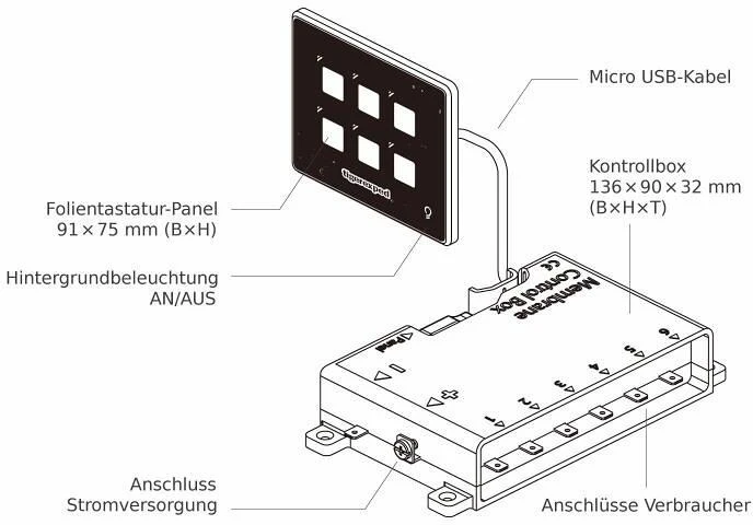 - Anschluss Verbraucher: Alle Verbraucher werden an der Kontrollbox mittels Flachstecker verbunden.