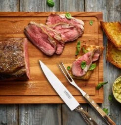 - 6x Steakmesser – 6x Steakgabel – 1x Tranchiermesser – 1x Tranchiergabel – 1x Schneidebrett aus Teak, 37 x 23 x 1,2 cm