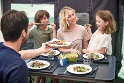 Robuster und leichter Klapptisch, der Platz für bis zu 6 Personen bietet. Ob Sie essen oder spielen möchten, es gibt viel Platz. Die robuste Tischplatte ist hitzebeständig, verfügt über verstellbare, ausziehbare Beine und große Füße, die für zusätzliche Stabilität sorgen. Wenn der Tisch nicht verwendet wird, kann er einfach zusammengeklappt werden.