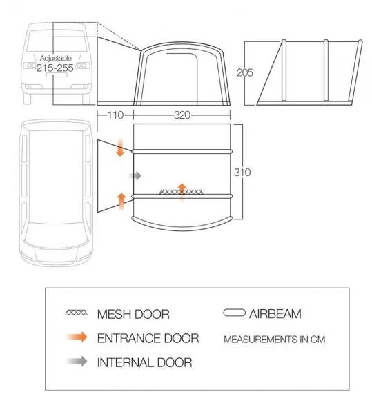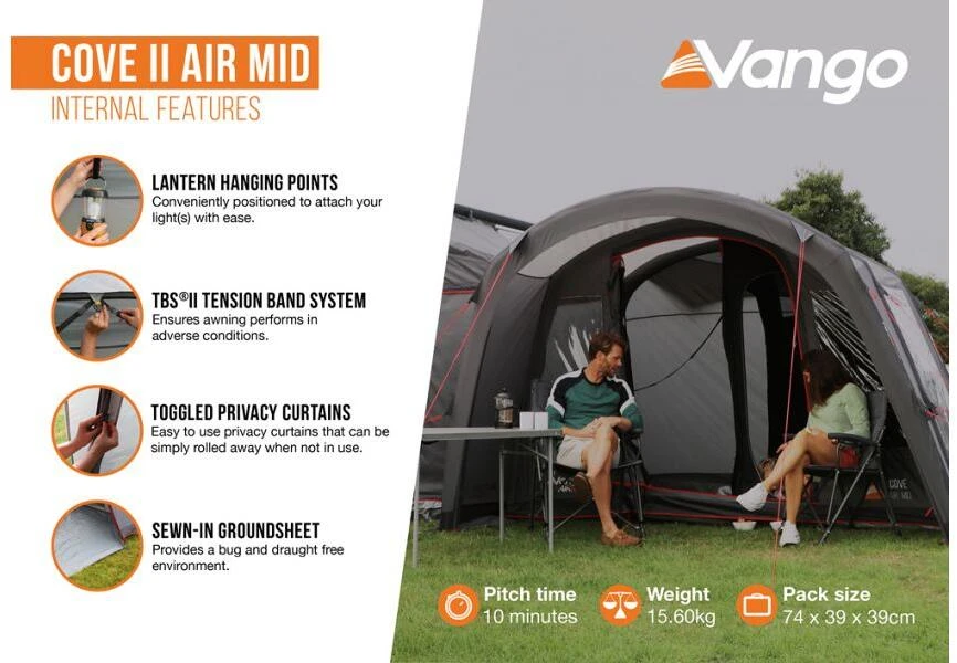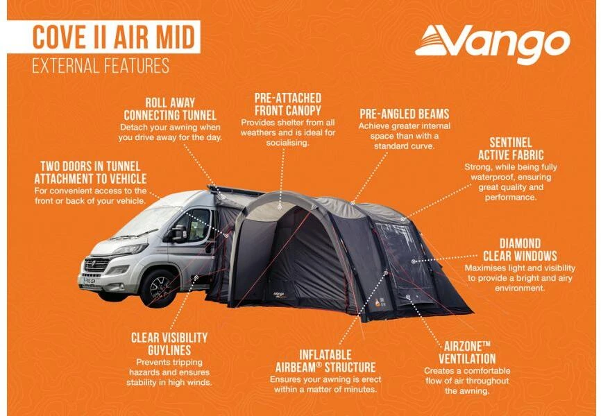 Das Vango Cove Vorzelt ist perfekt für Paare und junge Familien, die sich auf ein Abenteuer einlassen. Dieses aufblasbare Vorzelt ist in der gleichen Richtung wie Ihr Wohnmobil positioniert, so dass Sie immer den Blick auf die Aussicht gerichtet sind und zusätzliche Privatsphäre vor Ihren Campingnachbarn haben. Die eingenähte Bodenplane macht das Cove zum idealen Wohn- oder Stauraum, während die AirBeams® eine starke und steife Struktur bilden, die schnell und einfach aufgebaut werden kann. Die ideale Ergänzung zu Ihrem Wohnmobil für alle Ihre Ausflüge in die Natur.