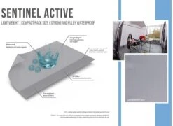 - Sentinel Active Gewebe – Wenn PackmaĂź und Gewicht die wichtigsten Einflussfaktoren bei der Wahl Ihres Vorzelts sind, wird speziell entwickeltes Sentinel Active Gewebe Ihre Anforderungen ĂĽbertreffen. Sentinel Active ist stark und gleichzeitig vollkommen wasserdicht, was eine hohe Qualität und Leistung bei kompaktem PackmaĂź gewährleistet.