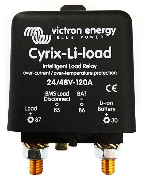 Der Cyrix-Li-Load schaltet ab, wenn sein Steuerungseingang den Zustand „free floating “ (offener Stromkreis) erreicht. Wenn sich die Batteriespannung nach dem Abschalten wieder erholt (das passiert, wenn keine anderen Lasten an die Batterie angeschlossen sind), wird der Ausgang des BMS hoch und der Cyrix schaltet nach 30 Sekunden wieder ein. Nach 3 Einschaltversuchen bleibt der Cyrix solange abgeschaltet, bis die Spannung mindestens 30 Sekunden lang auf über 13 V (bzw. 26 V oder 52 V) angestiegen ist (das ist ein Anzeichen dafür, dass die Batterie wieder aufgeladen wird).Alternativ kann eine BatteryProtect verwendet werden (Vorteil: sehr geringer Stromverbrauch).