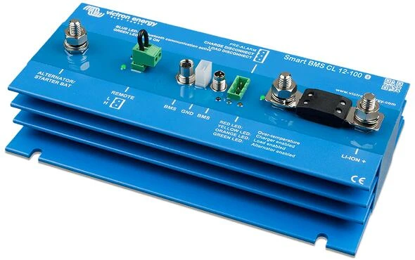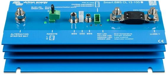 Übermäßige Eingangsspannungen und Transienten werden auf ein sicheres Level heruntergeregelt. Das Smart BMS CL stoppt den Ladevorgang bei Überspannung oder Übertemperatur der Zelle. Es hat drei Ausgänge, ähnlich wie das smallBMS: Lasttrennausgang: Der Lastausgang ist normalerweise hoch und wird frei schwebend, wenn die Zelle unter Spannung steht (Standard 2,8 V/Zelle, einstellbar an der Batterie zwischen 2,6 V und 2,8 V pro Zelle). Maximaler Strom: 10 mA. Der Lastausgang kann verwendet werden, um den FernEin/Aus-Eingang eines Batterieschutzes, eines Wechselrichters, eines DC/DC-Wandlers oder anderer Lasten zu steuern. Der Voralarmausgang kann als Warnung verwendet werden, wenn die Batteriespannung niedrig ist, und er wird kurz vor der Deaktivierung des Lasttrennausgangs wegen Unterspannung der Zelle auslösen.Der Voralarmausgang kann zur Ansteuerung eines Relais, einer LED oder eines Summers verwendet werden. Er kann als kontinuierliches oder intermittierendes Signal konfiguriert werden. Der Voralarmausgang ist normalerweise frei schwebend und wird bei drohender Unterspannung der Zelle hoch (Standard 3,1 V/Zelle, einstellbar an der Batterie zwischen 2,85 V und 3,15 V pro Zelle). Maximaler Strom: 1 A (nicht kurzschlussfest) Die Mindestverzögerung zwischen Voralarm und Lasttrennung beträgt 30 Sekunden. Der Ausgang des Ladegerätes ist normalerweise hoch und wird bei drohender Überspannung oder Übertemperatur der Zelle frei schwebend. Maximaler Strom: 10 mA. Der Ausgang „Charger“ (Ladegerät) ist nicht geeignet, um eine induktive Last wie z. B. eine Relaisspule zu betreiben. Der Ausgang „Charger“ (Ladegerät) kann zur Steuerung folgender Geräte verwendet werden: Das ferngesteuerte Ein-/Ausschalten eines Ladegerätes, eines Cyrix-Li-Laderelais, eines Cyrix-Li-ct-Batteriekombinators.