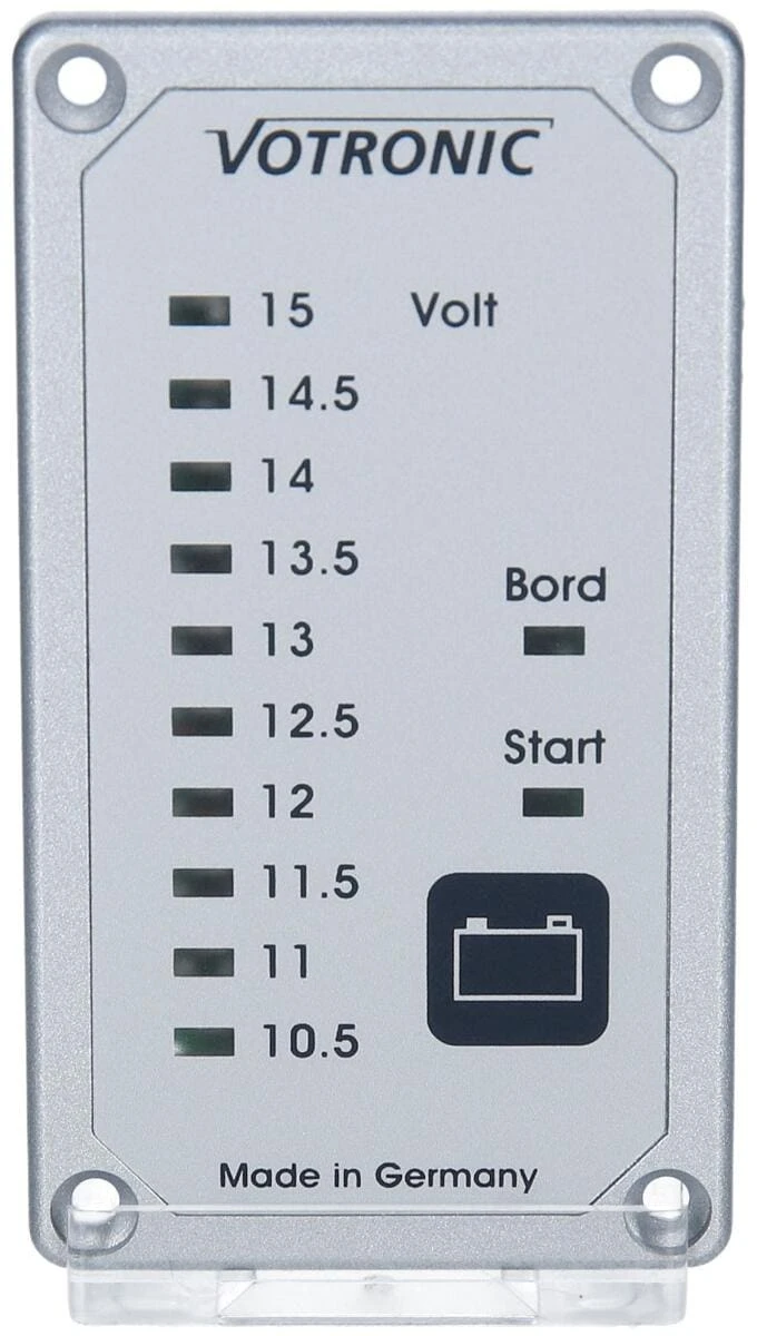 Dieses kompakte und robuste Gerät bringt wahlweise die zwei Spannungen der Bord- und der Starter-Batterie zur Anzeige.