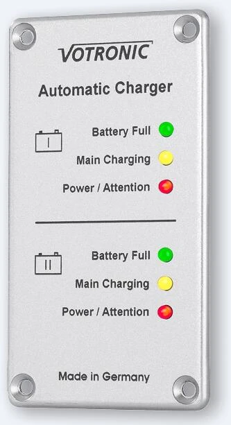 Die Fernanzeige gestattet die bequeme Fernkontrolle des Ladegerätes wenn dieses an einer schwer zugänglichen Stelle in Batterienähe montiert ist. Zur Überwachung der 2 getrennten Batteriekreise der VAC-Duo Ladegeräte. Die Kontroll-Leuchtdioden zeigen den jeweiligen Ladefortschritt an. Die Fernbedienung ist als Panel-Version ausgeführt und reiht sich sowohl optisch als auch mechanisch (gleiche Bauhöhe 85 mm) an die weiteren Anzeigen des VOTRONIC Modulsystems an.