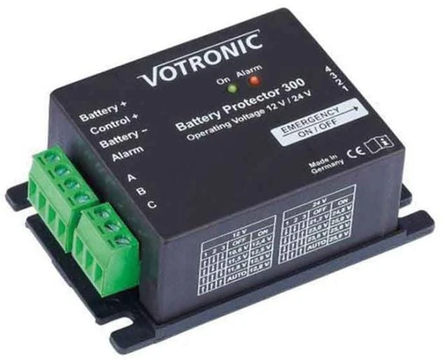 Batteriewächter protector 300 A – Vollautomatischer Schutz der Bordbatterie vor Tiefentladung. Als batterie-hauptschalter mit 1 poligem Schalter fernbedienbar möglich. Mit Not-Ein Funktion. Abschaltschwellen einstelbar. Mit Voralarm, Kontroll-LED, Schaltstrom 300 A, kurzzeitig bis 600 A. 12V/24 V umschaltbar.