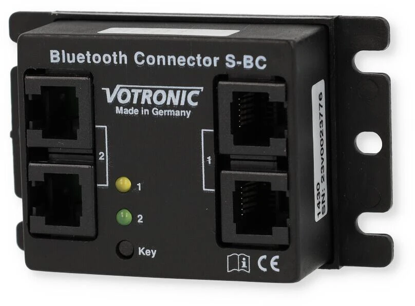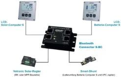 Der Anschluss des Bluetooth Connector S-BC ist denkbar einfach. Er wird einfach mittels der im Lieferumfang enthaltenen Modularkabel zwischen den Votronic Solar-Laderegler und den LCD-Solar Computer S oder zwischen den Smart- Shunt und den LCD-Batterie Computer S bzw. VPC Jupiter gesteckt.