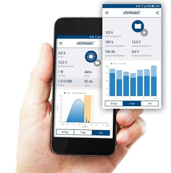 Auf diese Weise können die gesamten Informationen der Bordbatterie, wie Spannung, Lade- bzw. Entladeströme und die Restkapazität, als auch alle Daten der Solar-Anlage komfortabel über das Handy oder Tablet abgelesen werden. Zusätzlich werden die wichtigsten Daten protokolliert, graphisch aufbereitet und sind für einen längeren Zeitraum gespeichert. Selbst die Ausgabe als CSV-Datei für eigene Analysezwecke ist möglich. Natürlich kann der Bluetooth Connector S-BC auch jederzeit nachträglich installiert werden.