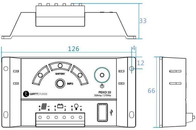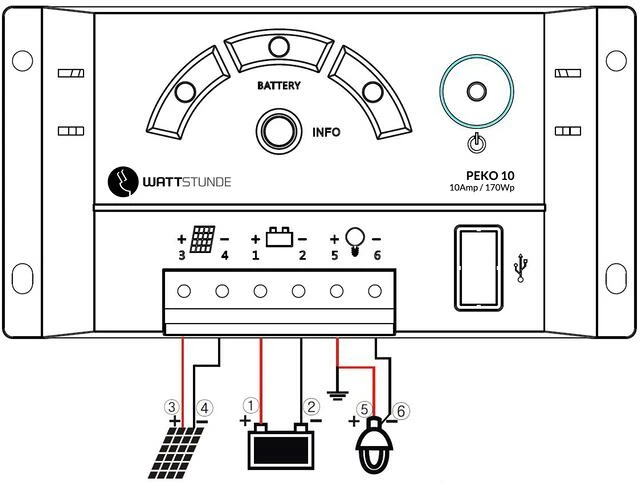 Der WATTSTUNDE PEKO10 Laderegler erkennt automatisch die Systemspannung und lädt Ihre Batterie entsprechend Ihrer Batteriespannung und dem Batterietyp zu jeder Zeit mit einer optimalen Ladekennline. Zusätzlich haben Sie mit dem integrierten USB Port eine Direktladfunktion und können Ihre Geräte wie Handy oder Tablets etc. direkt vom Laderegler aus laden.