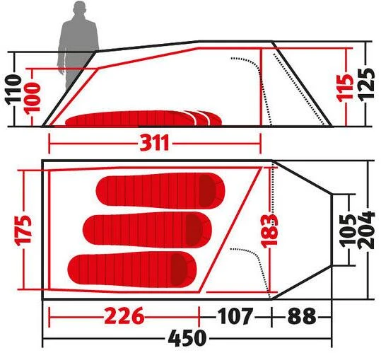 - Durch den asymmetrischen Schnitt des Innenzeltes entstehen im Zelt eine normale, eine lange und eine sehr lange Liegefläche