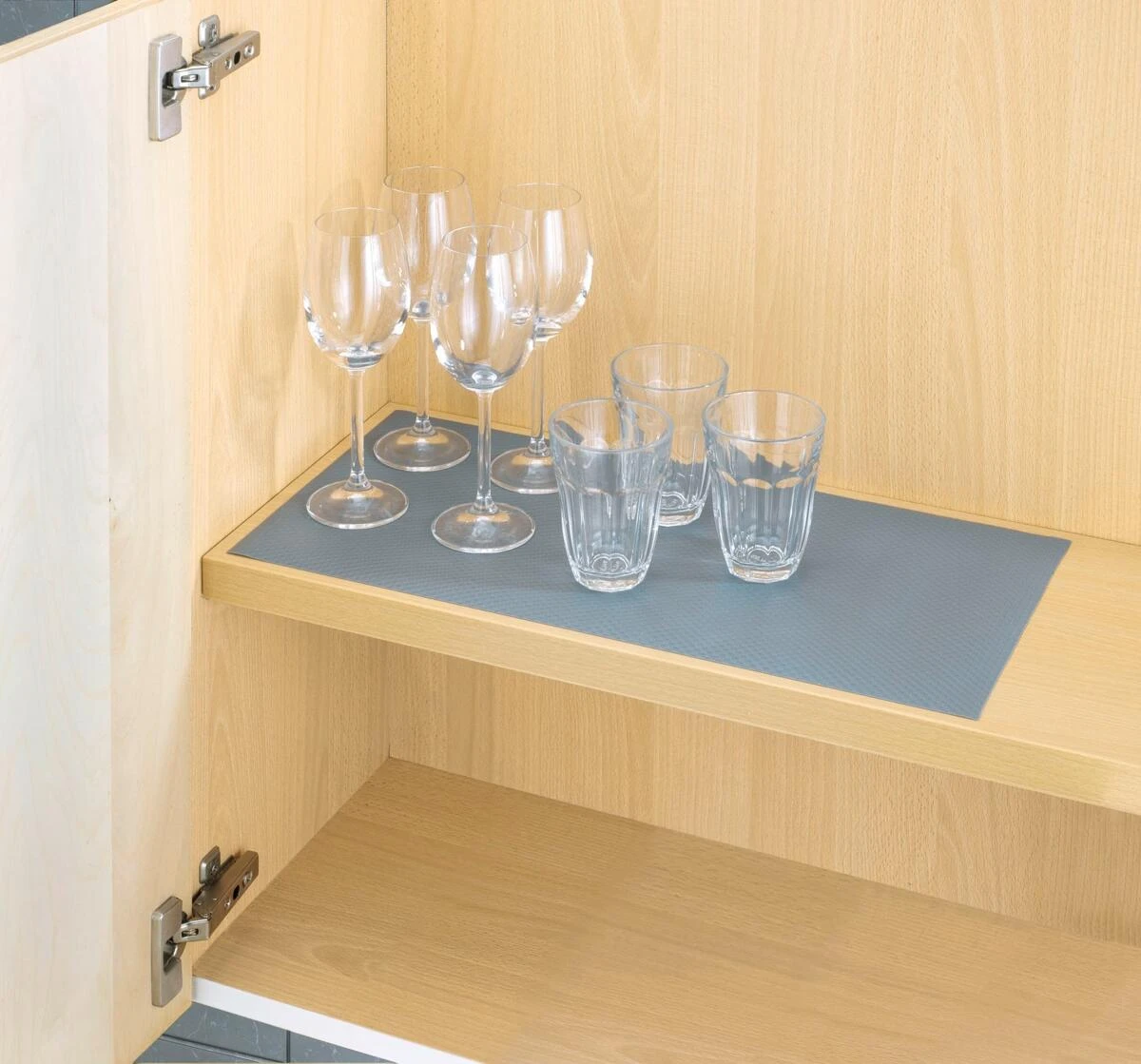 dealer Rutschstopp für alle Schränke und Schubladen: die extra starke Anti-Rutsch-Matte. Die praktische Matte sorgt für sicheren Stand von Gläsern, Töpfen und Kleinteilen. Alles kann sicher und funktional verstaut werden. Zudem wirkt die Matte geräuschdämpfend. Sie kann auf jede beliebige Länge und Breite zugeschnitten werden und bringt mit ihrem Grau trendige Akzente in jede Küchenschublade. Die Anti-Rutsch-Matte mit Noppen ist aus strapazierfähigem Kunststoff gefertigt und besonders stark.