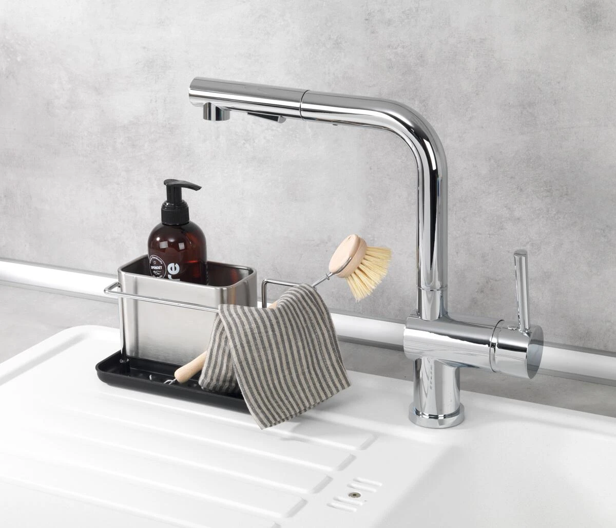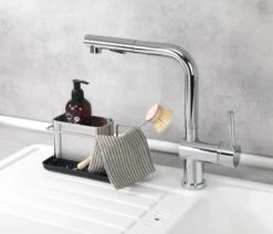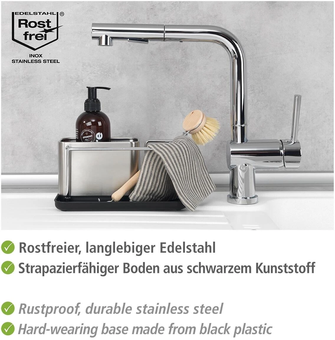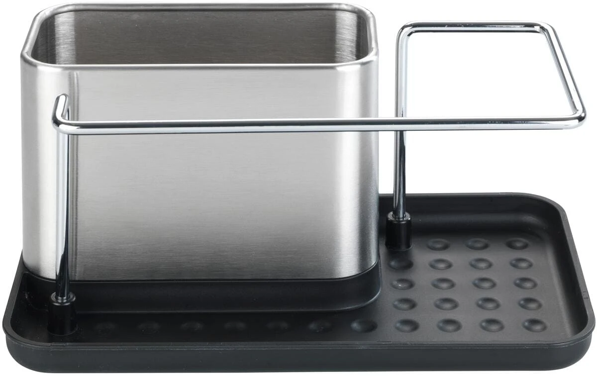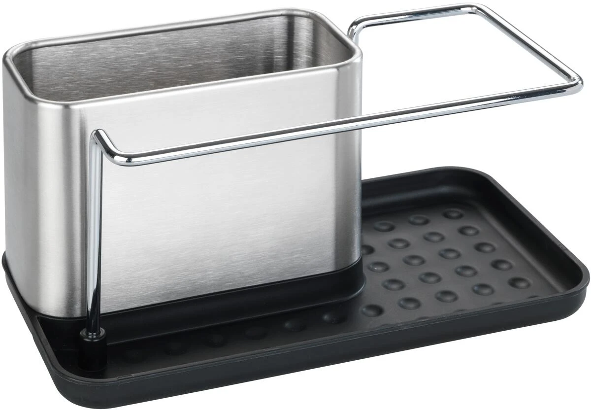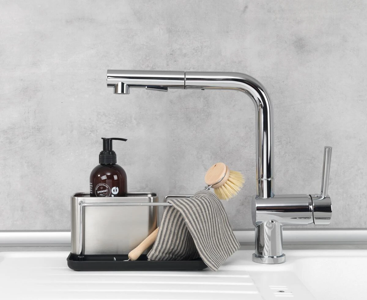 - Übersichtliche Aufteilung: Der Ordnungshelfer bietet eine separate Trockenstange für den Spül-Lappen, einen Behälter für Spülmittel und viel seitlichen Platz für Spülbürste, Schwamm
