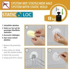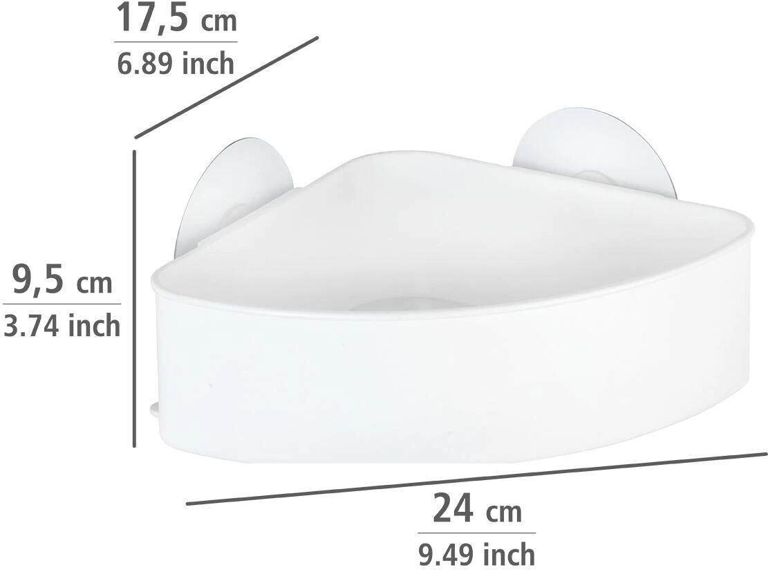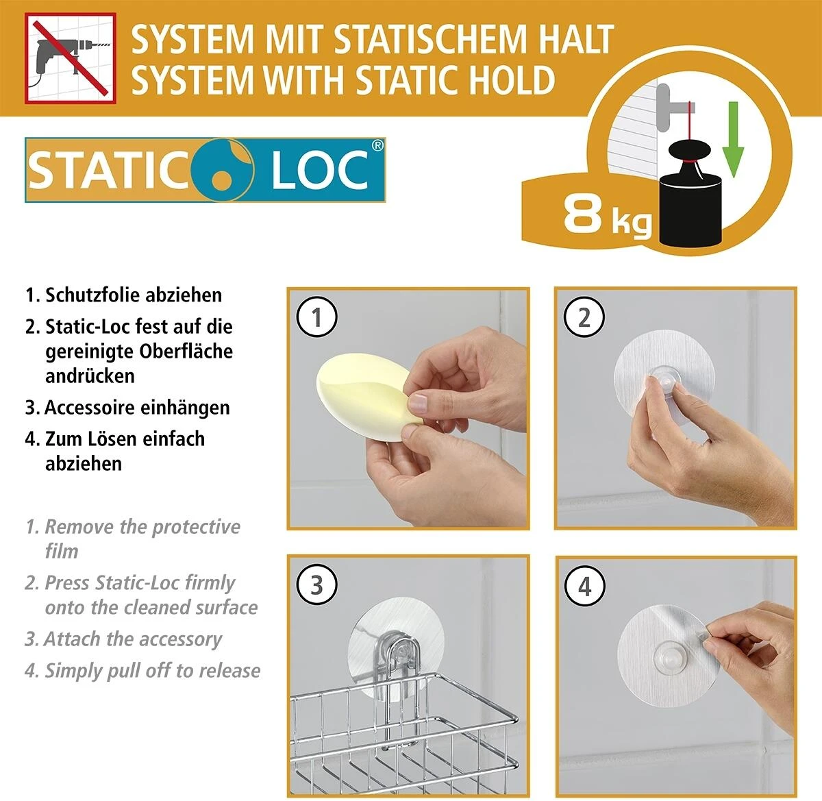 Innovativ und trendig, so setzen die neuen Wandablagen der Static-Loc® Serie Osimo von WENKO Akzente in jeden Haushalt. Die Static-Loc® Aufbewahrungskörbe haften durch statische Aufladung und bieten starken Halt auf glatten luftundurchlässigen Oberflächen (wie z.B. Fliesen, Glas, folierte Holzplatten), ganz ohne Schrauben und Bohren! Die Anbringung ist kinderleicht. Einfach die Schutzfolie abziehen und die Eckablage Osimo fest andrücken. Aufgrund der statischen Aufladung saugt sich das gummierte Pad direkt an. Das elegante Badregal aus hochwertigem, weißem Kunststoff ist absolut bruchsicher und kann sofort belastet und jederzeit repositioniert werden. Die platzsparende Eckablage Osimo bietet die ideale Stauraumnutzung für jedes Badezimmer. Alle Pflegeutensilien und Bad-Accessoires hält das praktische Eckregal gleich dekorativ griffbereit.