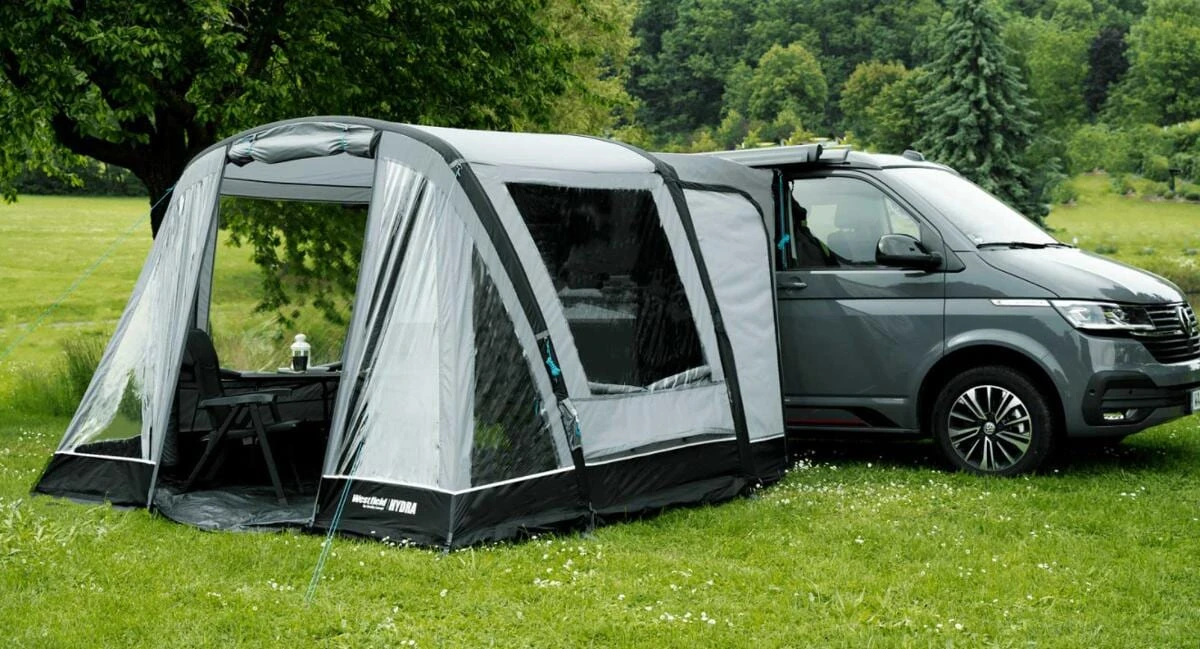 Das Luftvorzelt HYDRA 2022 für Bus oder Kastenwagen bietet durch seine veränderte Front-Luftschlauch-Form eine optimale Flächennutzung.
