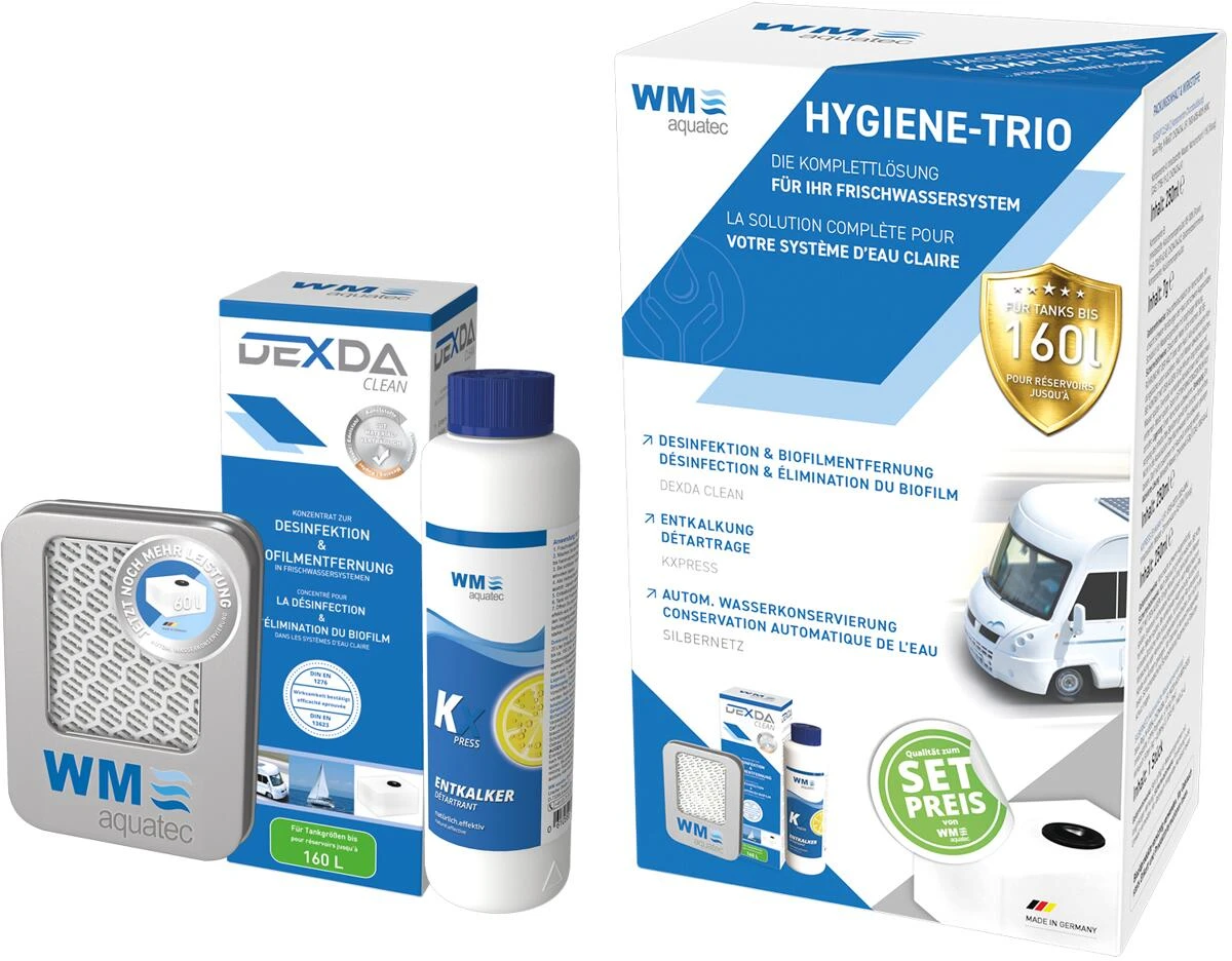 Das Desinfektionskonzentrat DEXDA® Clean zur Reinigung (Biofilmentfernung) und Desinfektion entfernt zuverlässig Bakterienbeläge, Pilze, Viren, Algen, Legionellen und Biofilme aus Tanks, Leitungen, Boilern etc. Dabei ist es 25x stärker als Aktivsauerstoff (Wasserstoffperoxid), ein zugelassenes Desinfektionsverfahren gemäß deutscher Trinkwasserverordnung und dabei pH-neutral in der Anwendung (sehr gut materialverträglich). Da das 2-Komponenten-System erst vor der Anwendung aktiviert wird, ergibt sich eine extra lange Haltbarkeit. Der Entkalker KXpress (250ml) mit dem natürlichen Wirkstoff der Zitrone (reine Zitronensäure) entkalkt Ihr komplettes Frischwassersystem und beseitigt dabei auch unangenehme Gerüche. Er ist mit einem Kindersicherungs-Verschluss versehen und ist auch zur effektiven Entkalkung von Wasserkochern und Kaffeemaschinen geeignet. Beide Produkte sind einzeln wie auch zusammen anwendbar.