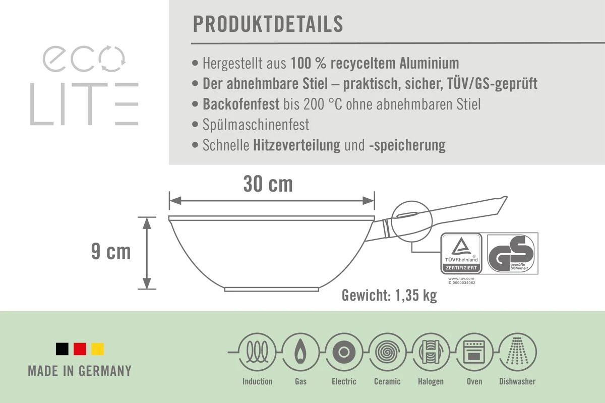 ECO LITE Wok- und Rührpfanne mit abnehmbarem Stiel – Das nachhaltige Kochgeschirr. Neu gedacht, leicht gemacht. In ECO LITE steckt jede Menge Technologie für jede Menge Nachhaltigkeit: Der Pfannenkörper besteht aus 100% recyceltem Aluminium. Der abnehmbare Stiel zu 50% aus nachwachsenden