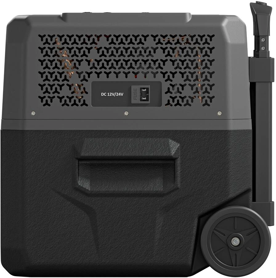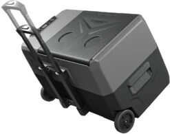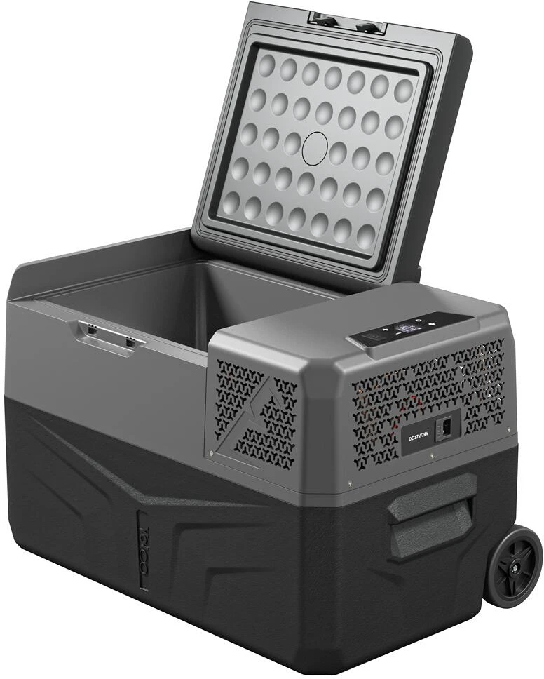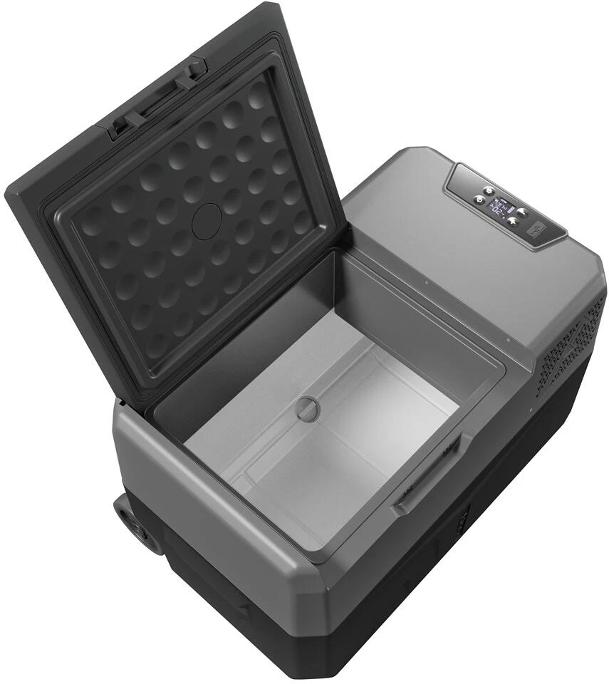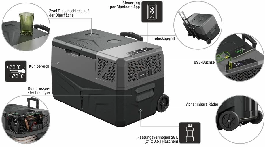 Das Bedienfeld mit gut lesbarer Flüssigkristallanzeige ermöglicht die intuitive Steuerung des Geräts. Die Kühlbox ist mit einem Bluetooth 5.0-Sender ausgestattet und kann per App für mobile Geräte (Android/iOS) gesteuert werden. Die eingebaute USB-Buchse kann auch Smartphone oder Tablet mit Strom versorgen. Ergonomische Tragegriffe, Teleskopgriffe und Räder ermöglichen eine bequeme Verlagerung der Kühlbox.