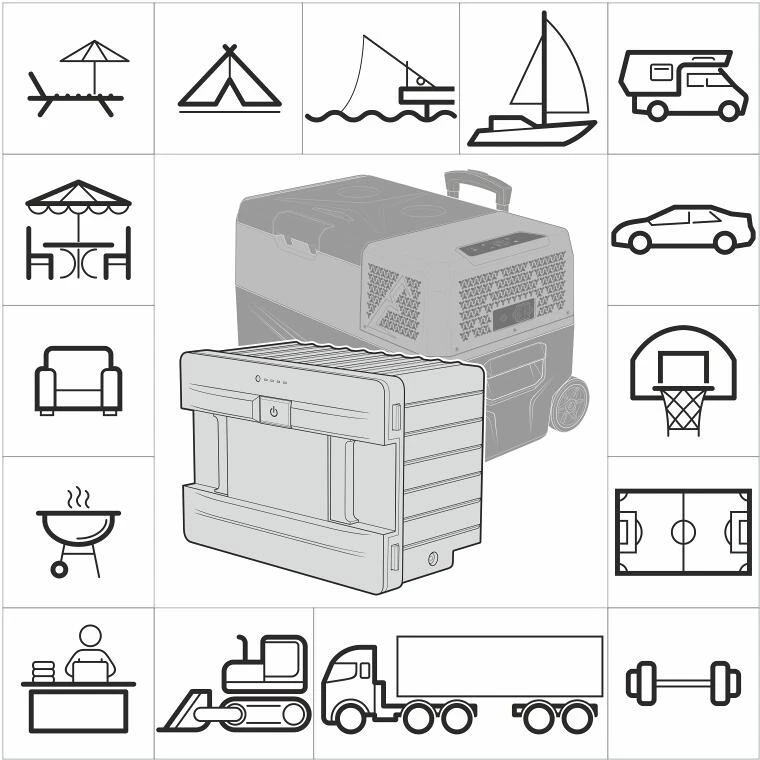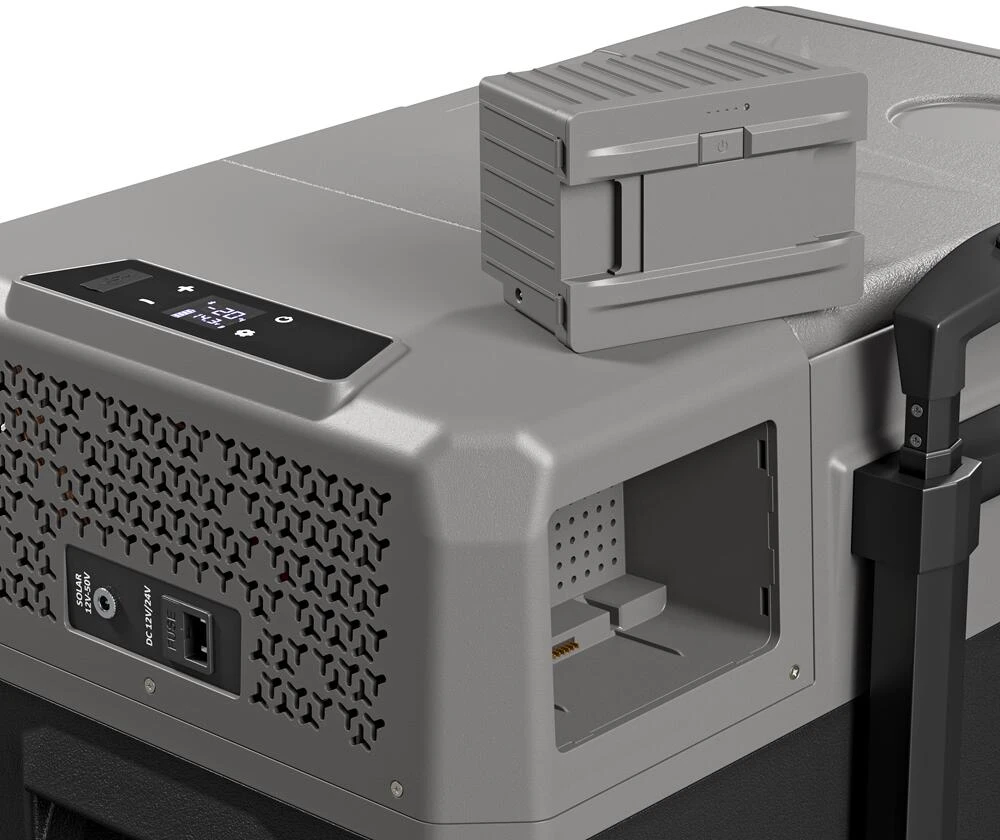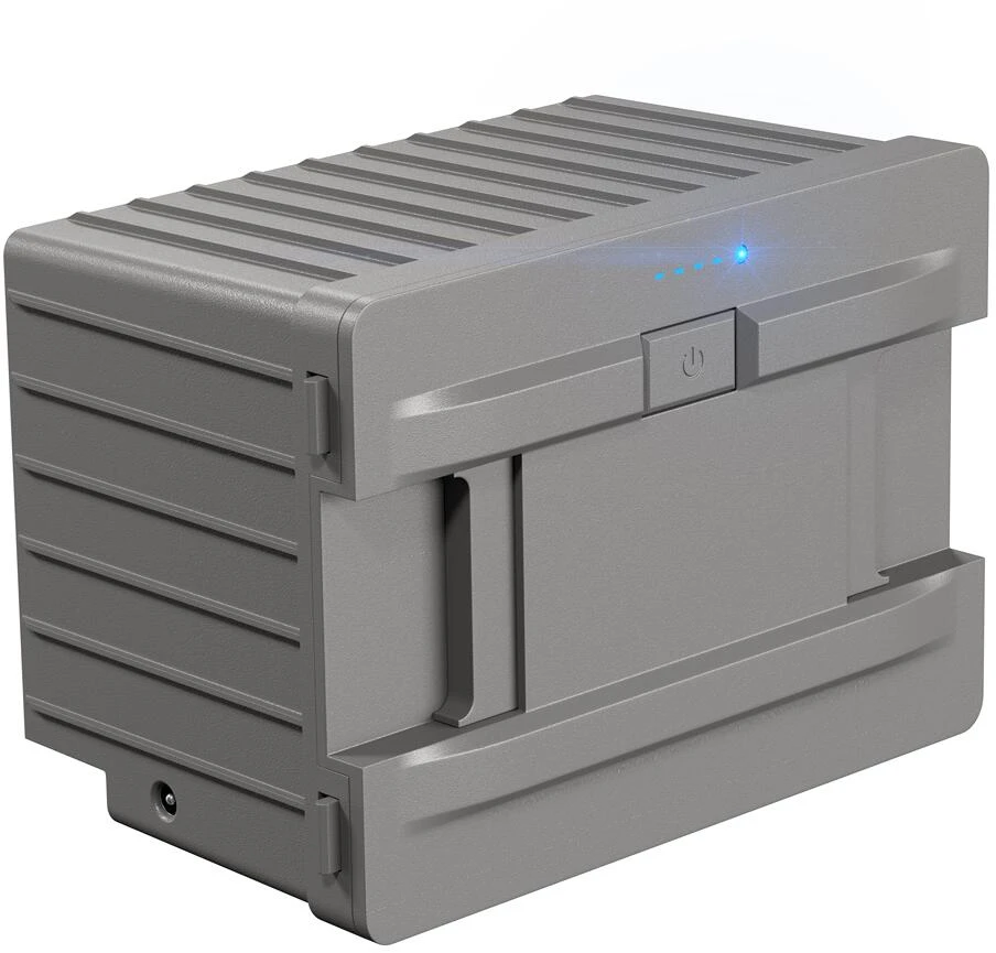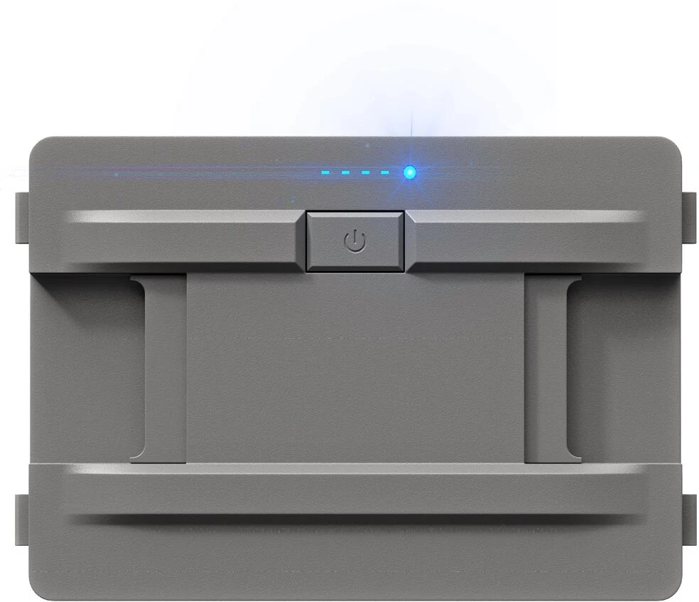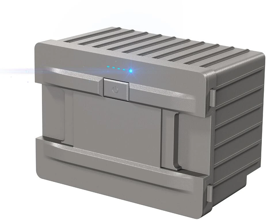 Batterie zur Verwendung mit Yolco-Kühlboxen als zusätzliche Stromquelle. Der Batteriestand wird durch ein vierstufiges LED-System angezeigt.