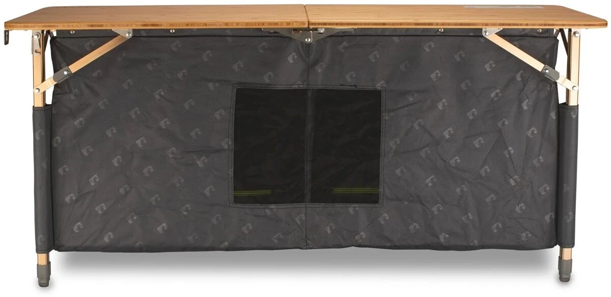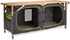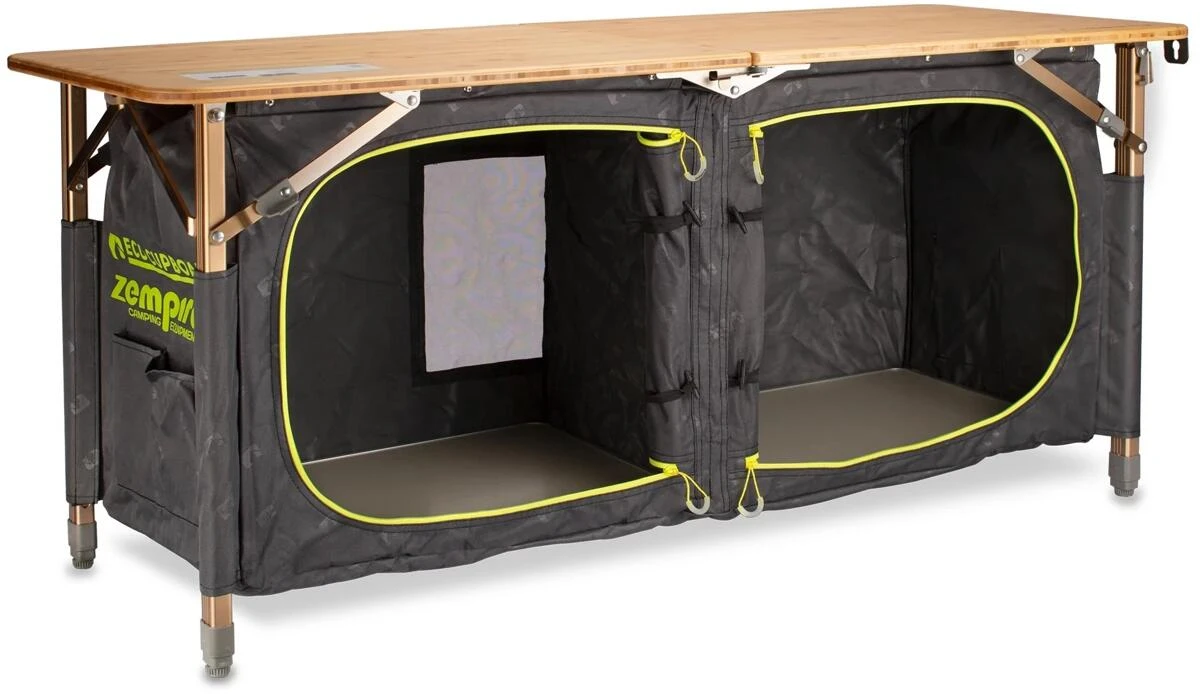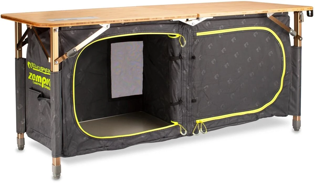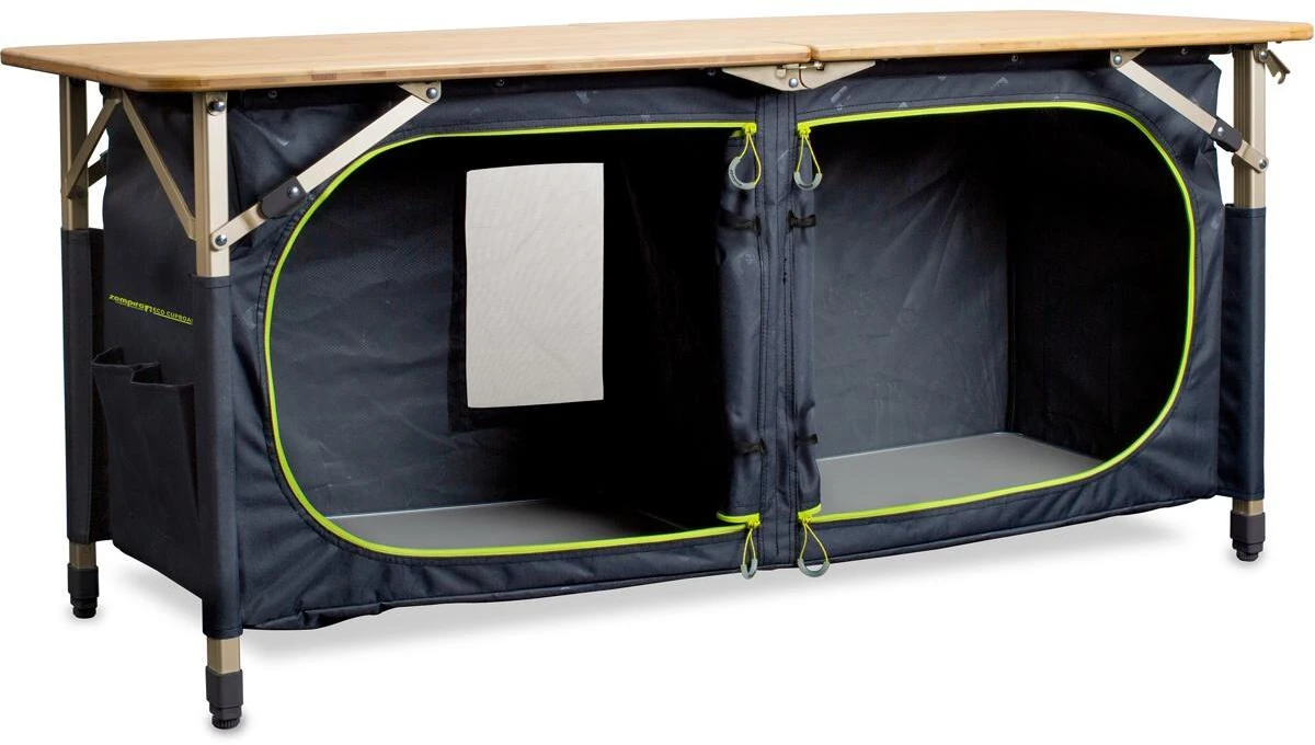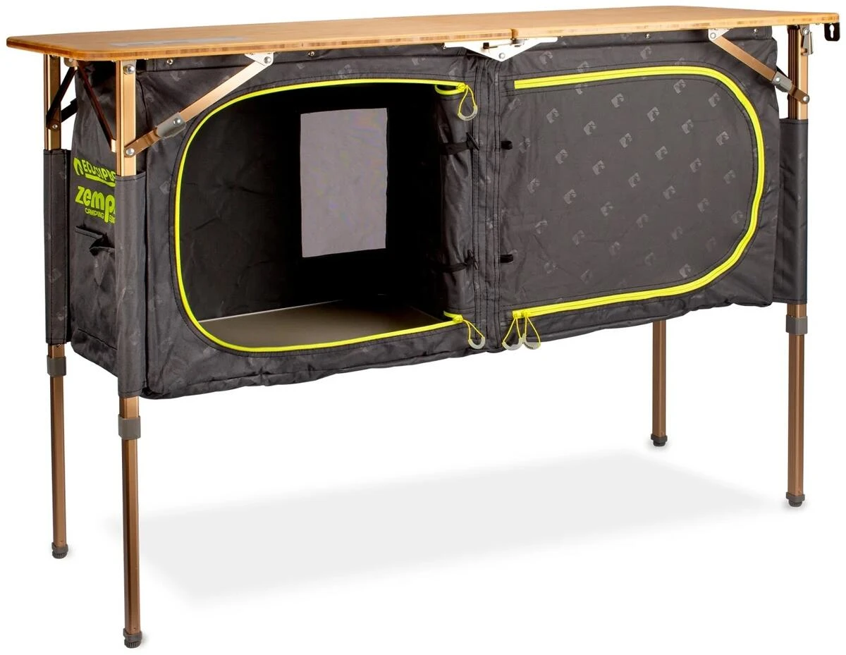 Das Eco Cupboard von Zempire, ein Blickfang mit seiner Bambus-Tischplatte und vielseitig einsetzbar noch dazu. Die verstellbare Höhe und die breite Bambus-Tischplatte machen diesen anpassungsfähigen Doppelschrank als must have für die Aufbewahrung im Schlafzimmer, im Wohnbereich oder in der Küche. Das vollständig faltbare Rahmendesign ermöglicht es, den Schrank für Reisen klein zusammenzulegen, wobei der Schrank und die Beine sicher im Inneren verstaut sind. Rahmenschlösser ermöglichen es, den Rahmen in einer offenen oder geschlossenen Position für zusätzliche Stabilität und Komfort zu verriegeln. Praktischerweise in wetterfester Ausfürhung dank seines rostsicheren Aluminiumrahmen.
