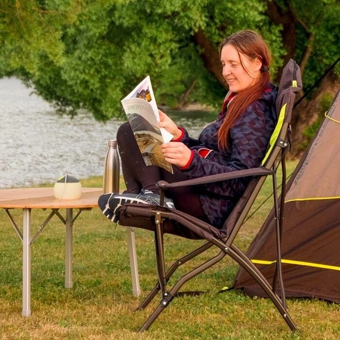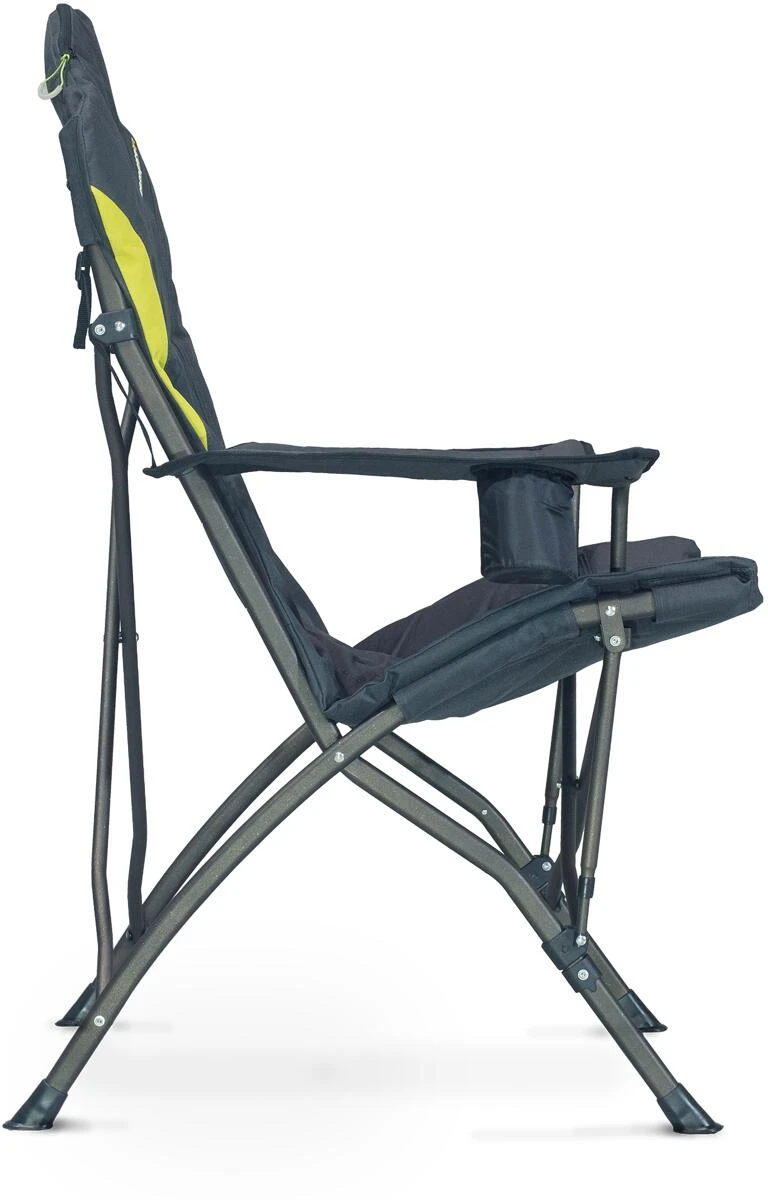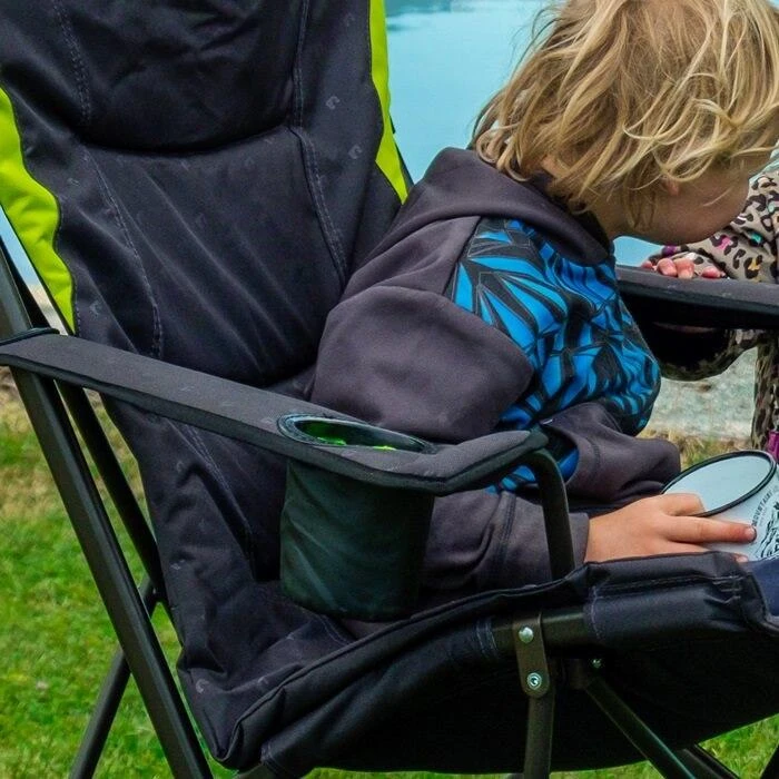 Der Stargazer ist ein luxuriöser Campingstuhl. Die extra hohe Rückenlehne ist stützend und vollständig gepolstert und sorgt für viel Komfort. Die Öffnung mit Reißverschluss an der Oberseite bietet den perfekten Stauraum für die Tragetasche und bildet ein integriertes Kissen. Mit den verstellbaren Armschlaufen kann die Armhöhe an jeden Benutzer angepasst werden. Ein integrierter isolierter Getränkehalter sorgt dafür, dass die Getränke an heißen Sommertagen kalt bleiben. Er hat eine Öffnung mit Reißverschluss an der Oberseite, um das Kissen mit etwas Füllung zu versehen.